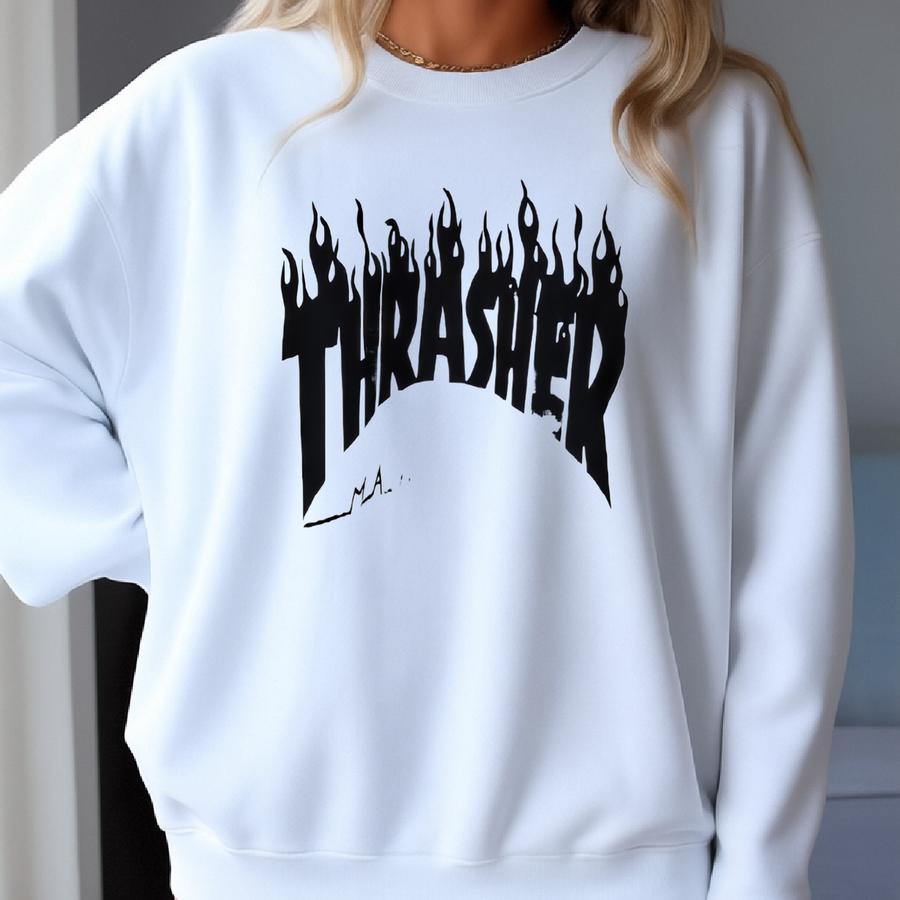 Vintage Distressed Thrasher Zine Skateboarding Sweatshirt Thrasher Hoodie Thrasher Puulover Printed Logo White Color Men’s Fit M Sweatshirt