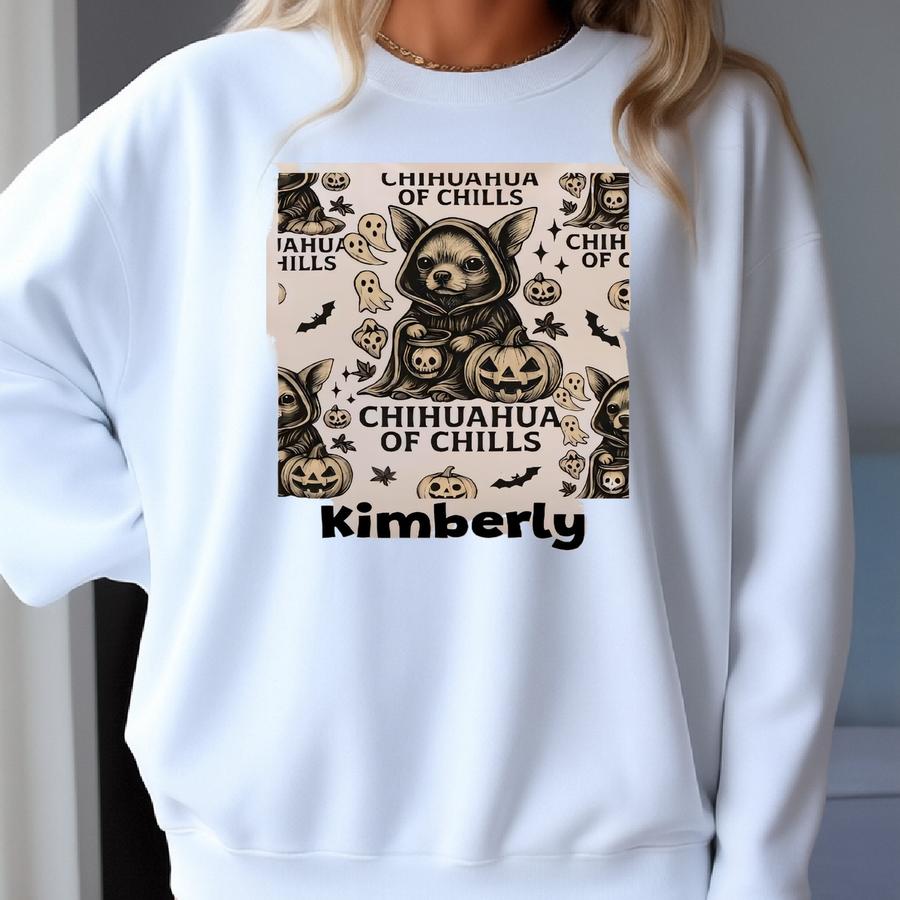 Personalized Halloween Tee – Chihuahua In Hooded Robe With Ghosts, Bats Skulls, Custom Pumpkin Ghost Cotton Canvas Sweatshirt