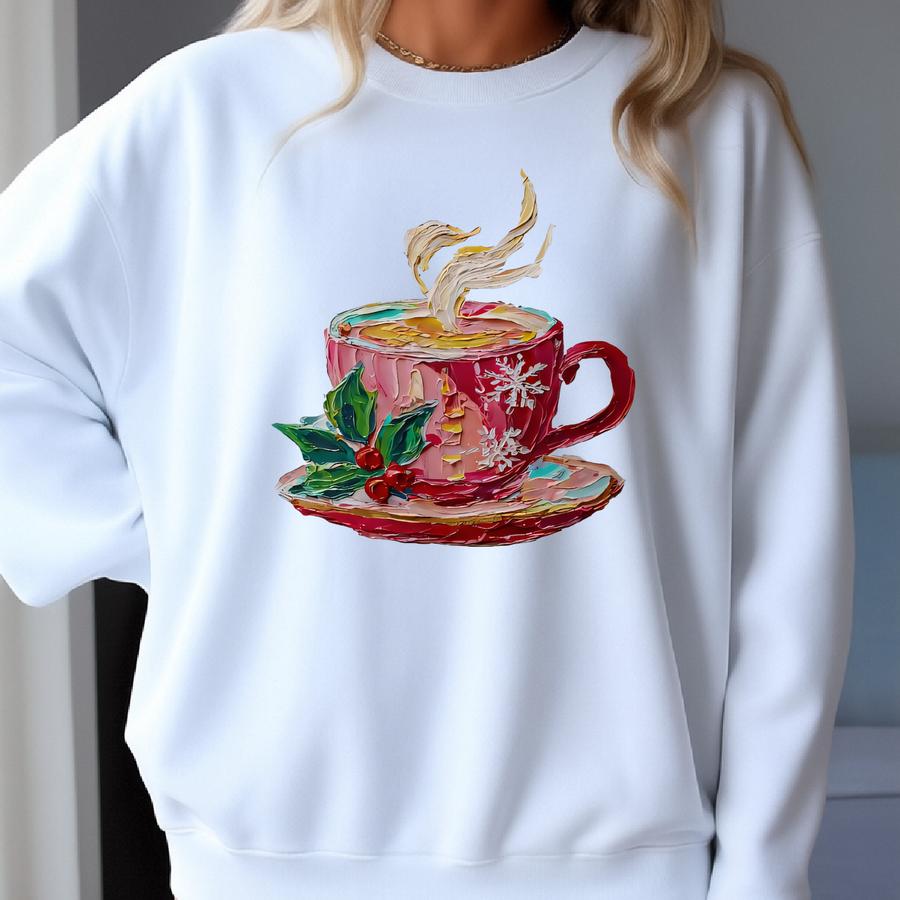 Christmas Coffee Cup T-shirt Or Sweatshirt: Holly Berries, Snowflake Design, Festive Sweatshirt
