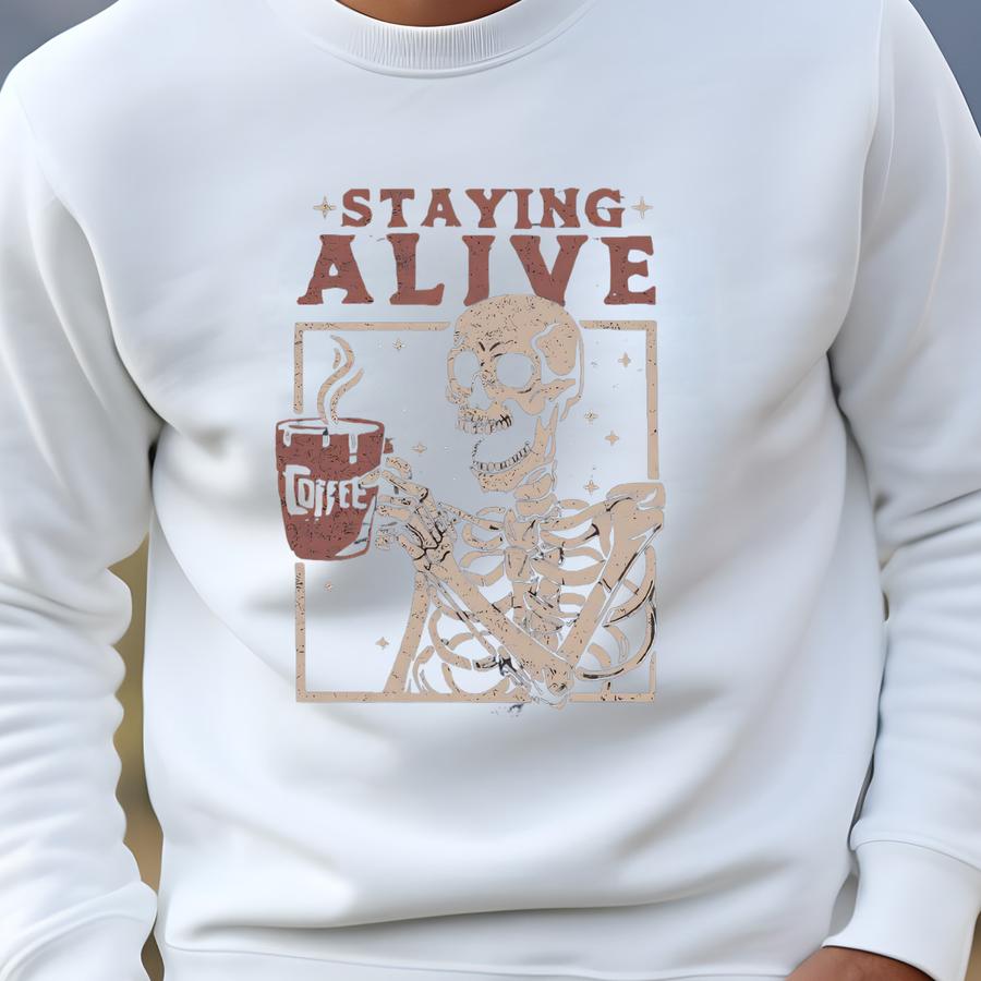 Staying Alive Shirt, Halloween Skeleton Coffee Shirt, Funny Skeleton T-shirt, Coffee Lovers Gift, Skull Vintage T-shirt For Women, Adult Tee Sweatshirt