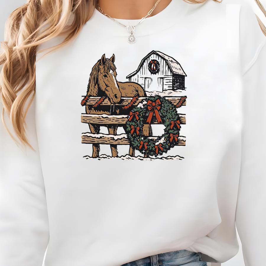 Horse Christmas T-shirt: Barn Wreath Farmhouse Unisex Graphic Sweatshirt