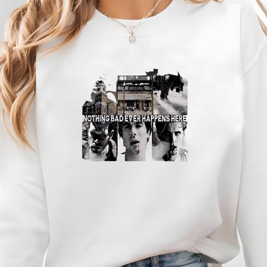 Mystic Falls Tee , Nothing Bad Ever Happens Here, Tvd Vampire Diaries Tee , Damon Salvatore ,stefan ,klaus, Tvd Tee Sweatshirt