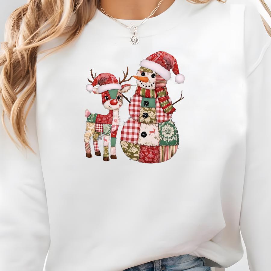 Patchwork Reindeer Snowman Shirt: Rustic Christmas Graphic Tee Sweatshirt