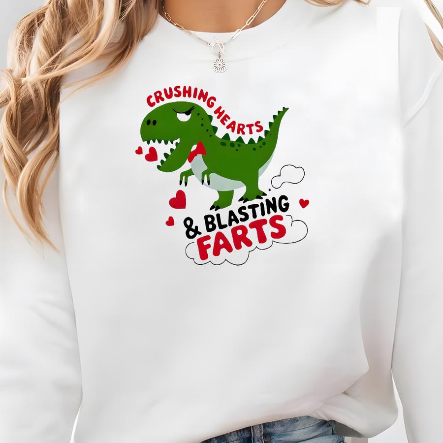 Dino Crushing Hearts Blasting Farts T-shirt: Funny Valentines Day Graphic Tee Sweatshirt