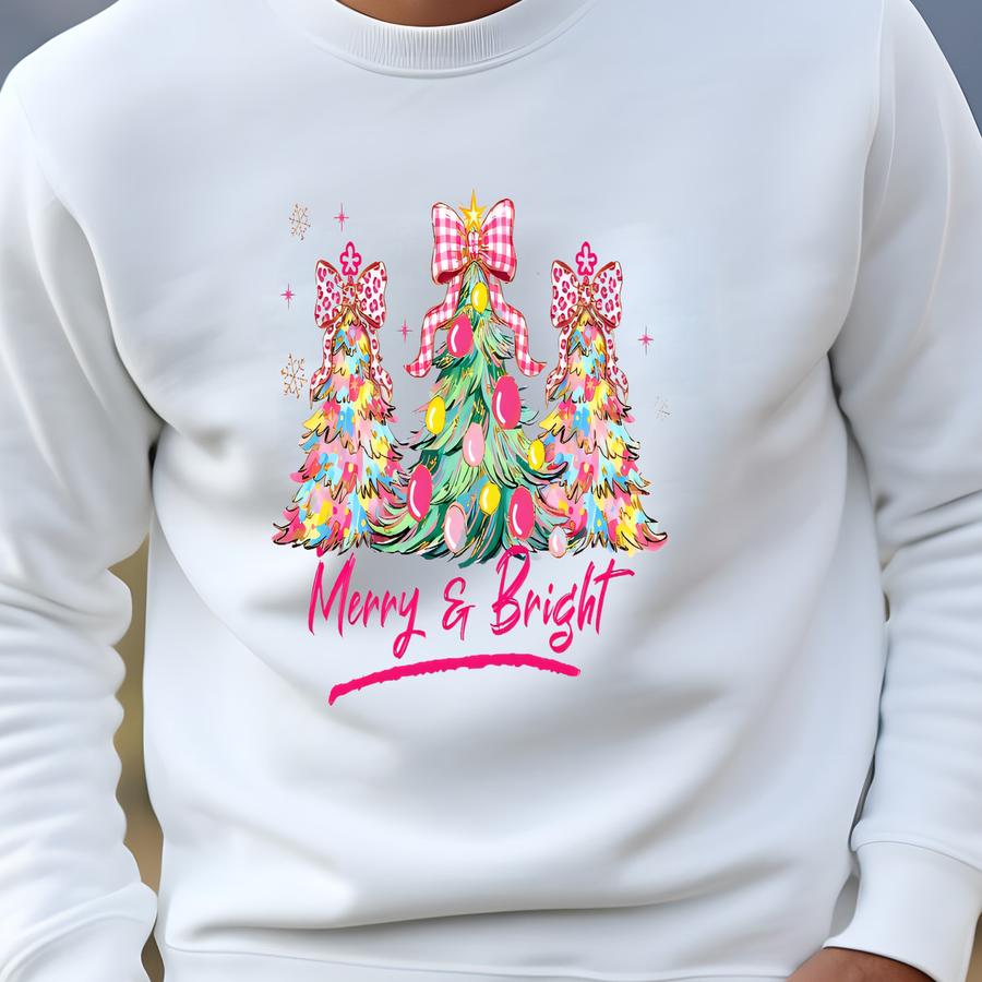 Christmas Pastel Tree Sweatshirt Merry Bright Xmas Tree Tee Pink Holiday Festive Bow Lights Tshirt Cute Jolly Tee Merry Christmas Tshirt Sweatshirt