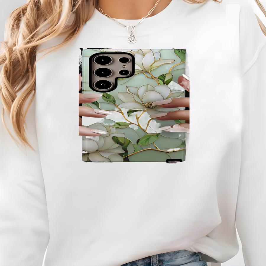 Magnolia Pearl Stained Glass Phone Case, Faux Stained Glass Gold Floral Coquette Covers Galaxy S25 S24 S23 S22 S21 S20 Ultra Pro Fe Sweatshirt