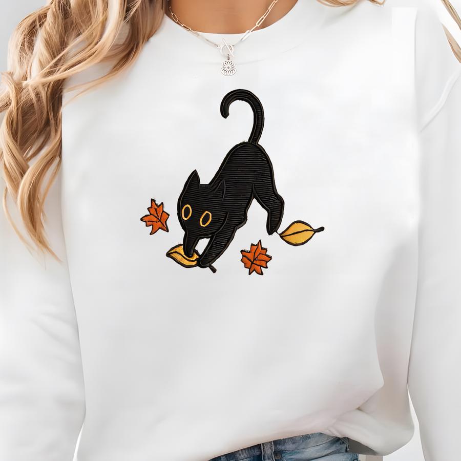 Cute Cozy Black Cat Sweatshirt | Autumn Leaves Fall Pullover | Halloween Cat Lover Shirt | Cozy Y Gift Crewneck Sweatshirt