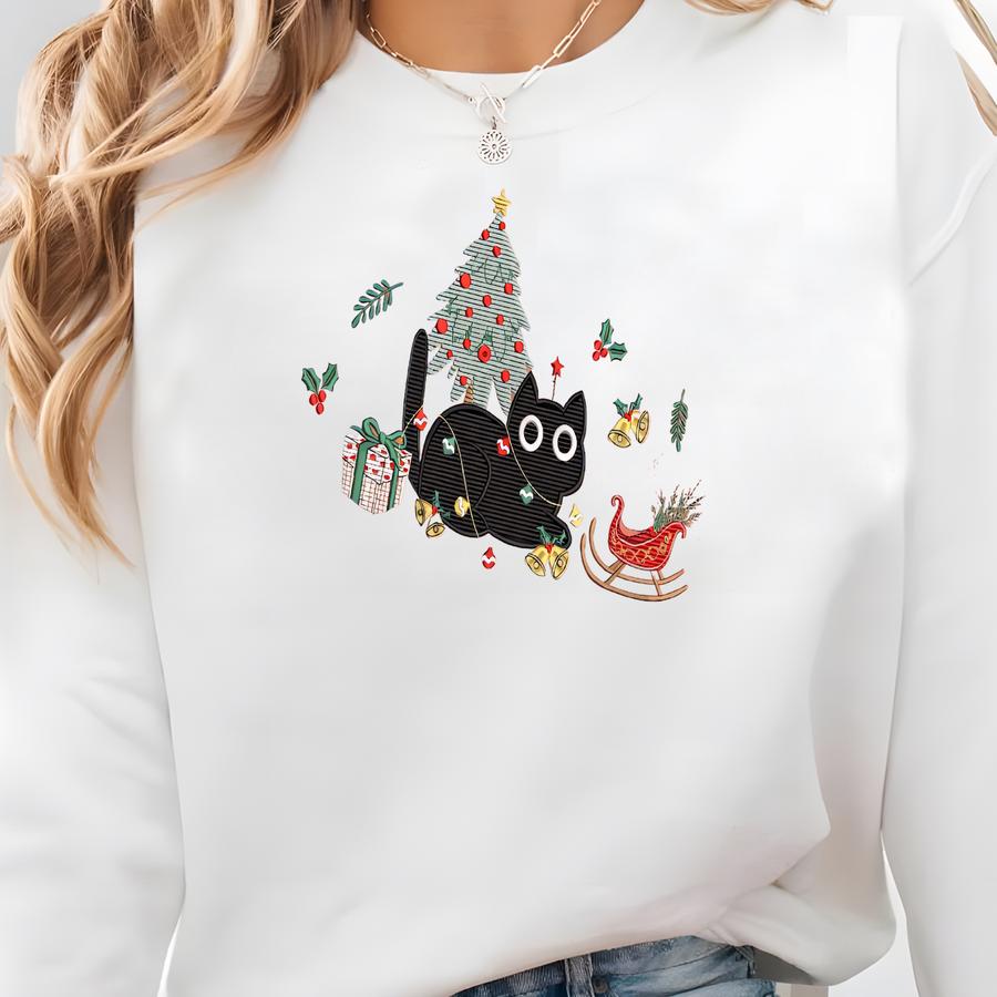 Christmas Cat Sweatshirt, Comfort Color And Classic Sweatshirt Choice Shirt, Cute Black Cat With Christmas Tree Shirt Sweatshirt