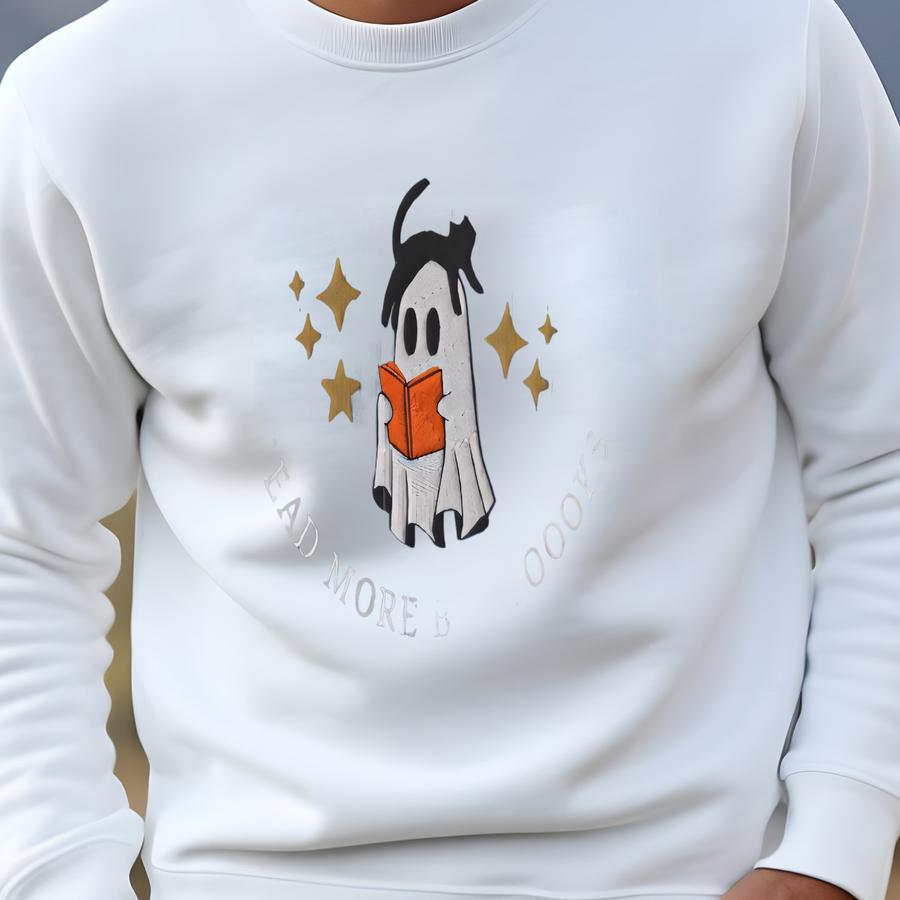 Book Reading Ghost Sweatshirt, Read More Books Halloween Shirt, Spooky Season Bookish Cat Mom Sweatshirt
