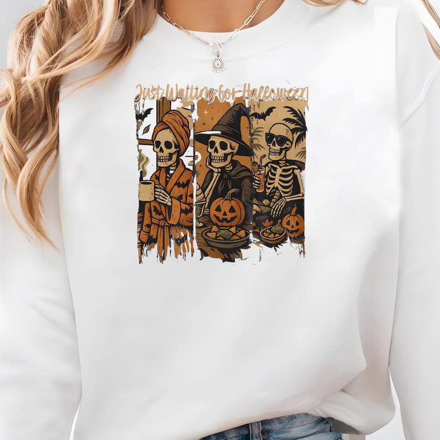 Just Waiting For Halloween ® Shirt, Funny Skeleton Pumpkin Shirt, Spooky Fall Graphic Shirt, Retro Halloween Womens Shirt Sweatshirt