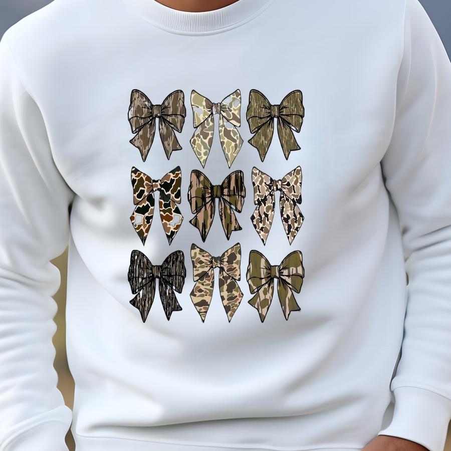 Camo Bow Sweatshirt, Camo Coquette Bow Shirt, Duck Hunting T-shirt, Hunting Lover Gift, Women's Camouflage Bow Sweatshirt, Camouflage Bow Sweatshirt
