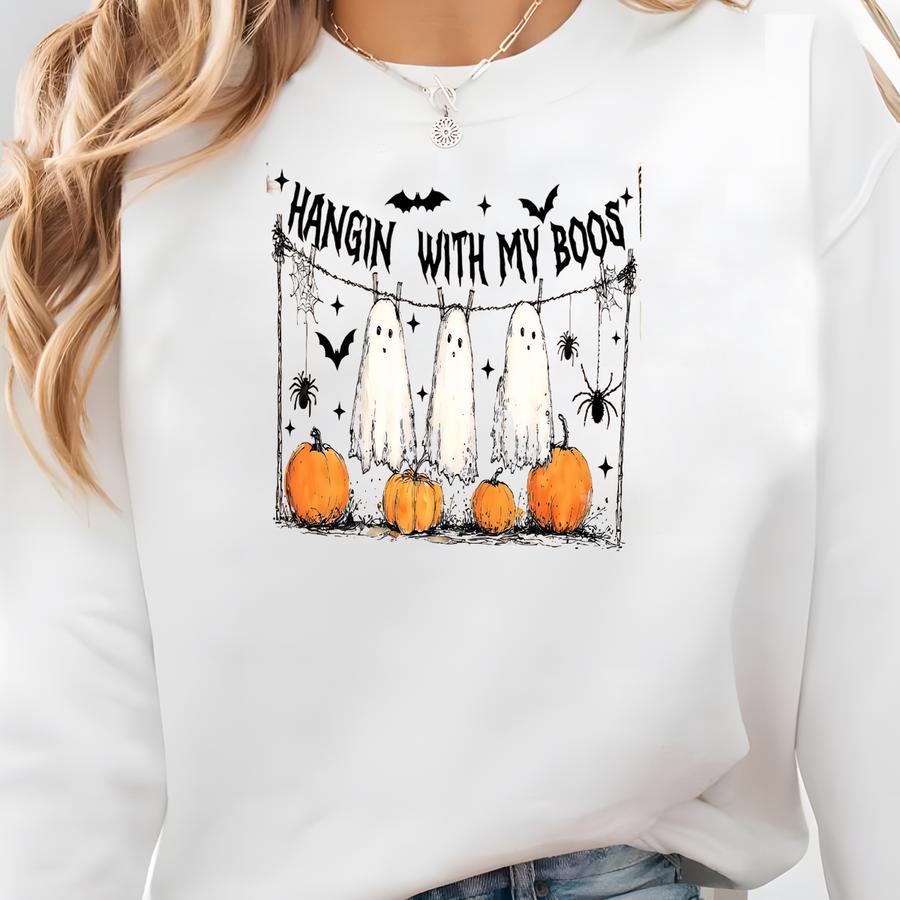 Funny Hanging Ghosts Halloween Png, Hangin’ With My Boos Shirt Design, Cute Pumpkin Bat Digital Download Sweatshirt