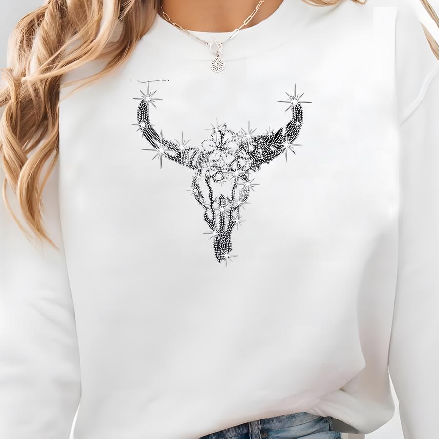 Rhinestone Longhorn T-shirt: Western Cow Skull Boho Tee Sweatshirt