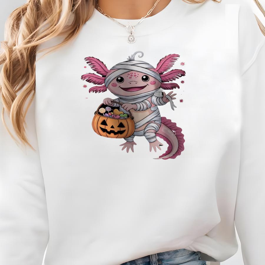 Cute Mummy Axolotl T-shirt, Halloween Candy Axolotl Tee, Kids Halloween Shirt, Adorable Axolotl Halloween Costume Sweatshirt