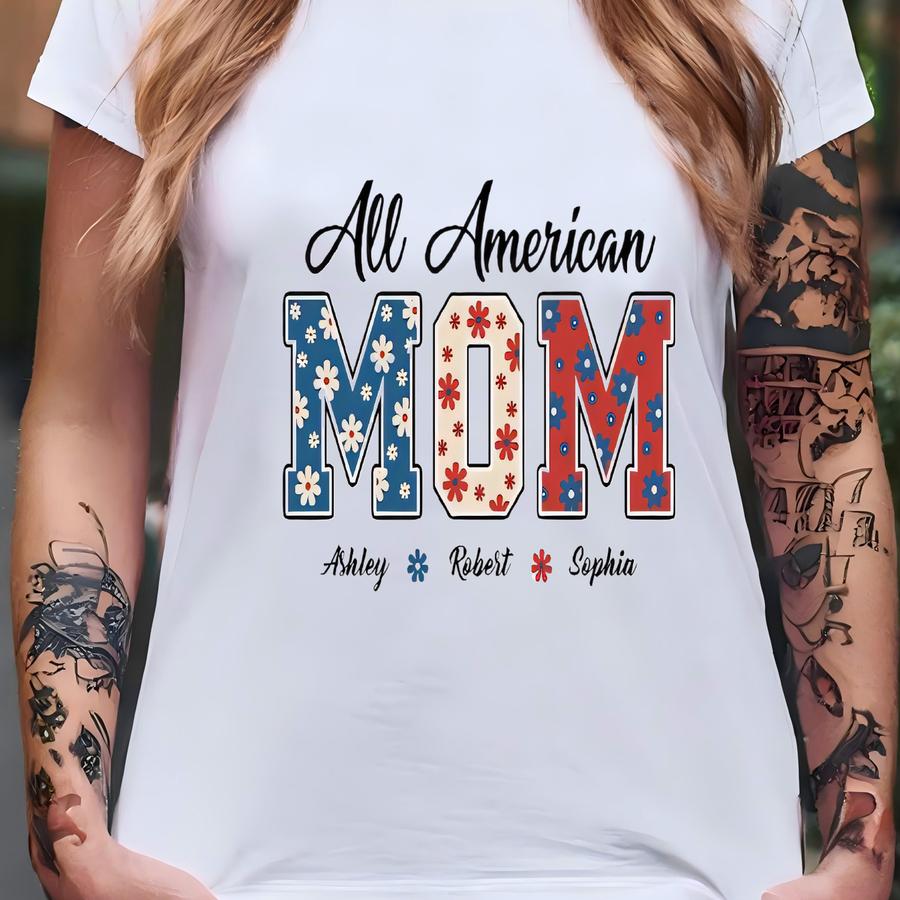 Mom 4th Of July Floral - Personalized Apparel - Independence Day Gift For Mom, Usa Flag Flower Letters Tee With Kid's Names T-shirt