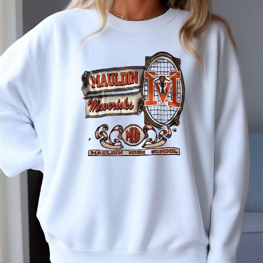 Vintage 90s Fruit Of The Loom Tag Mauldin Mavericks Highschool Big Logo Printed Sweatshirt Crewneck Color Grey Size X-large Sweatshirt